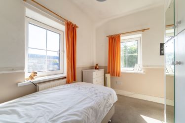 Well lit room having Georgian style dual windows to the side and front elevation, high textured ceiling, double panelled radiator, dado rail and aerial socket, fitted with a wardrobe providing hanging rail and shelving.