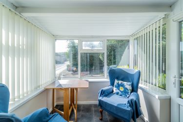 Dwarf wall with double glazed units with slate roof, white upvc door leading to the side elevation, exposed stone wall, tiled flooring and panelled Upvc ceiling.