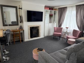 The property comprises an open-plan reception room, enhanced by a striking fireplace, creating a warm and inviting atmosphere for relaxing or entertaining guests. The open-plan kitchen features countertops and an abundance of natural light, making it both stylish and highly functional. A dedicated breakfast area provides an ideal spot for morning coffee or casual dining.